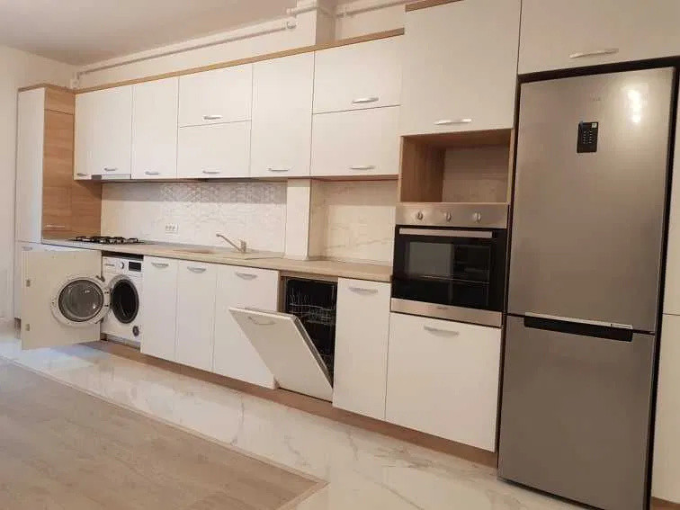 Bucătărie echipată cu electrocasnice: mașină de spălat vase, cuptor, plită, hotă, frigider